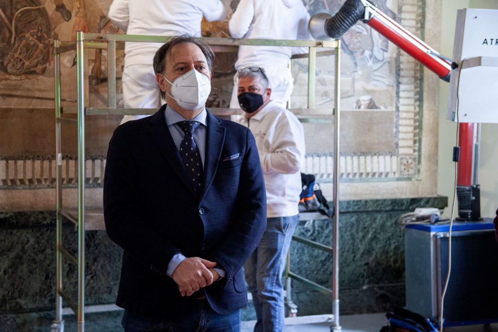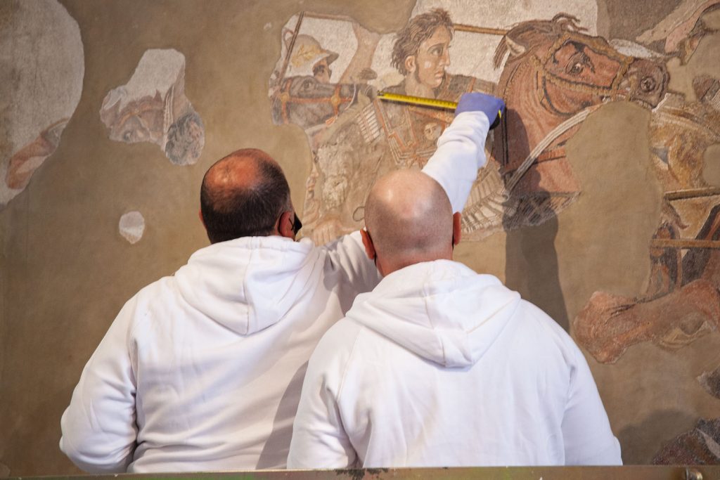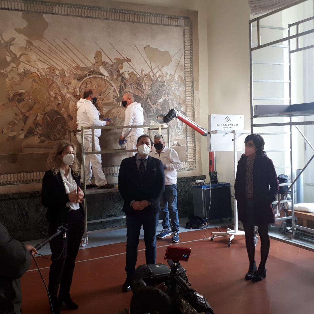 “Ci vuole coraggio per affrontare un restauro di questo tipo, il coraggio che ci trasmette questo grande personaggio, che si lanciò alla conquista del mondo”, ha detto oggi il direttore del MANN, Paolo Giulierini “Un coraggio che in parte è mancato nei tempi passati, quello di porsi il problema del mosaico di Alessandro. Ringrazio il prof Antonio De Simone che mi ha subito sottolineato l’ urgenza e l’ importanza di questo restauro, il nostro architetto Amanda Piezzo. Il Museo, con il suo laboratorio di restauro guidato proprio da oggi da Maria Teresa Operetto, per questa impresa non si è chiuso in se stesso. Lavoriamo insieme a importanti partner scientifici, Università, alla TIM in collaborazione con NTT DATA e una tecnologia che si coniuga con il miracolo quotidiano delle mani dei nostri restauratori. Sarà un restauro ‘trasparente’, visibile ai visitatori alla riapertura dei musei ed in alcune fasi anche on line. Tutti insieme ci prendiamo questa grande responsabilità, in coordinamento con l’ Istituto centrale per il restauro (ICR) diretto da Alessandra Marino, che ringrazio. Tra un anno organizzeremo la grande mostra Alessandro e la via delle indie, con la Regione Campania. Perché il nostro Museo, simbolo dell’archeologia italiana nel mondo, guarda a Oriente e ad Occidente”.