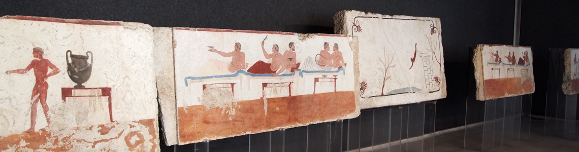 Portati alla luce nel 1968, in un periodo dominato da visioni del mondo improntate al materialismo storico, gli affreschi che decoravano la tomba furono all’inizio interpretati come scene di vita quotidiana, di godimento dei piaceri terreni. Tuttavia, sono molte le incongruenze che questa teoria suscita: il tuffo, per esempio, non si riesce a contestualizzare nel repertorio figurativo greco.
