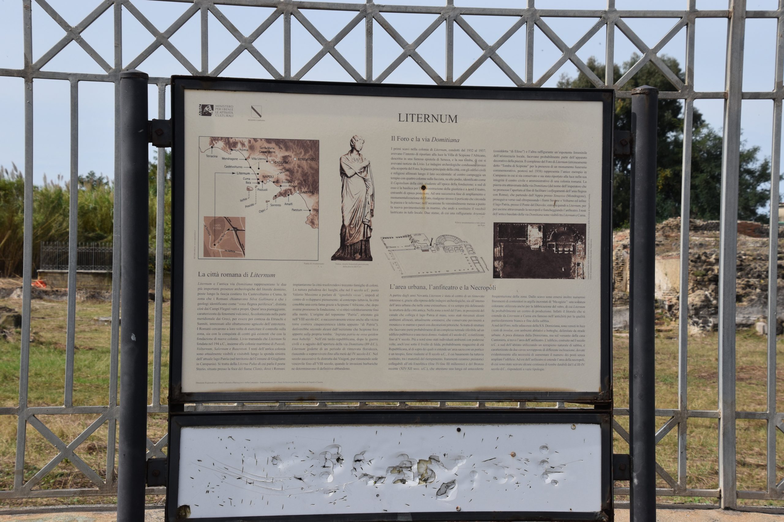 Publio Cornelio Scipione Africano, militare e politico romano, colui che sconfisse Annibale nella battaglia di Zama e poi infangato per concussione, ingiuriato da Catone, è morto e riposa qui, sotto una lapide abbandonata segnalata solo da un cartello posto poco fuori il viale che snoda fino all’ingresso del parco archeologico di Liternum.