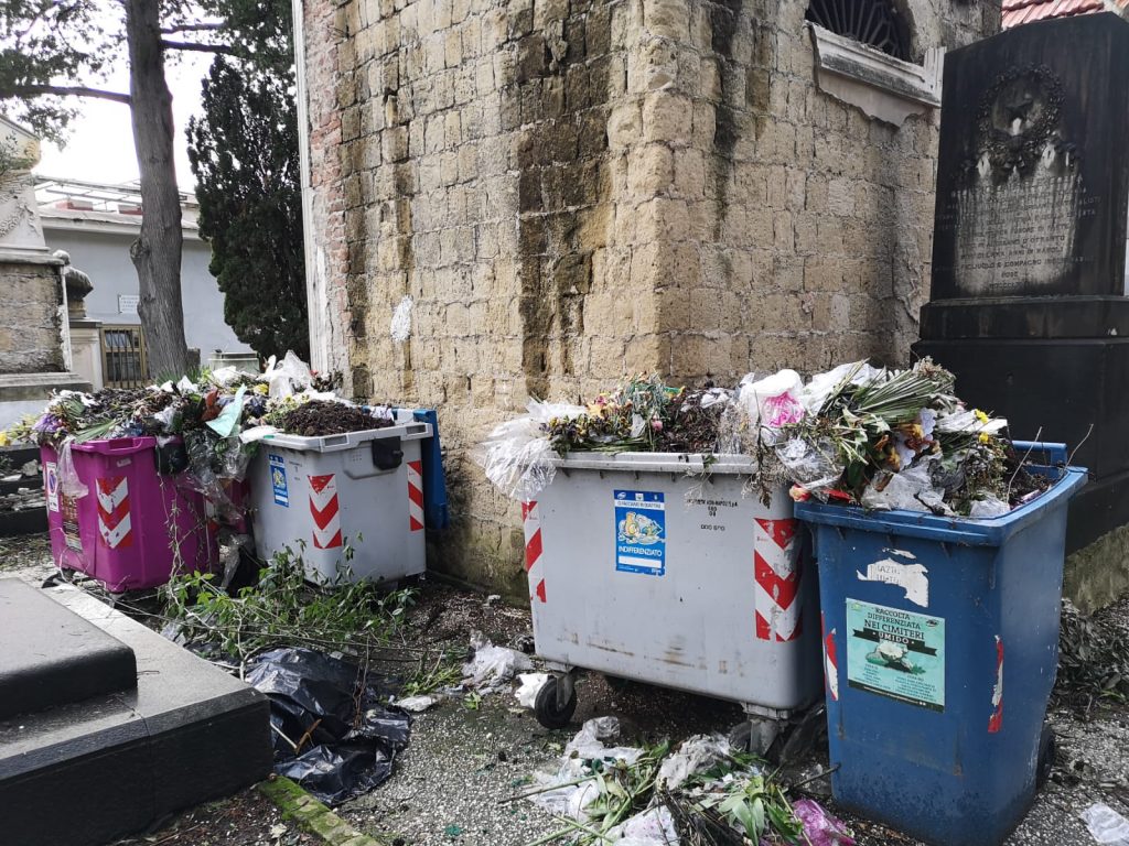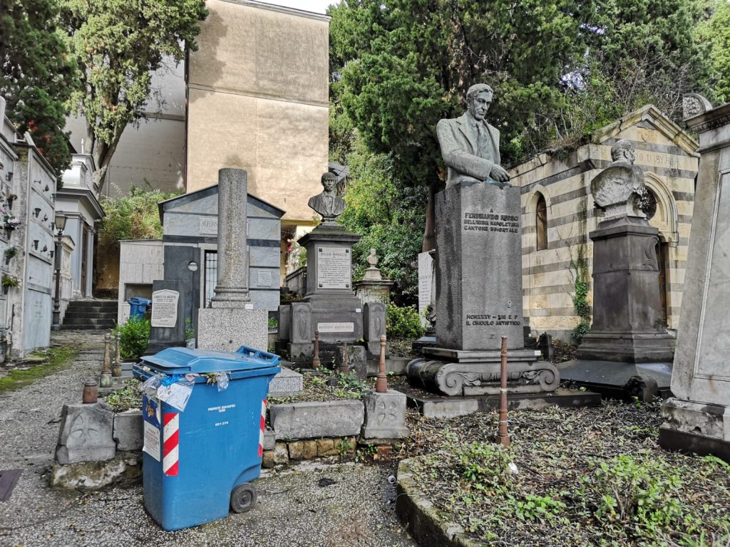 Si ha la possibilità di depositare un fiore sulle lapidi marmoree di personaggi come Viviani, E.A. Mario, Benedetto Croce, Enrico de Nicola, Francesco de Sanctis, Salvatore di Giacomo, Vincenzo Gemito, Saverio Mercadante, Ernesto Murolo, Ferdinando Russo, Antonio Niccolini che hanno portato alto il nome di Napoli nel mondo. Dovrebbe quasi essere un dovere civico per i napoletani e l’ amministrazione dovrebbe tenere in grande considerazione o quantomeno essere più accorta nella gestione di questo quadrato cimiteriale (come leggerete e vedrete), invece ci ritroviamo un Ferdinando Russo la cui tomba è situata vicino ad un cassone dei rifiuti, pieno tra le altre cose e la lapide di E.A Mario a cui manca incredibilmente la lettera M.
