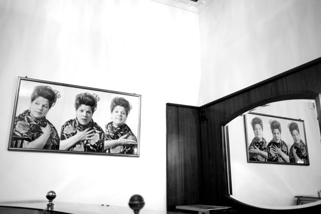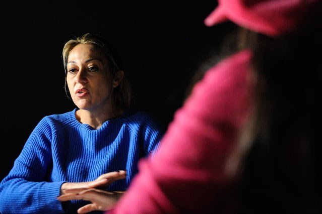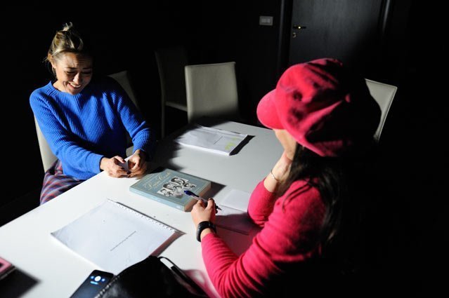 E così è: saliamo in una sala in penombra, vicino ai camerini, attraversando il palco pieno di fili e quinte in movimento, e lì lei ci accoglie, senza trucco e con i capelli raccolti in una coda di cavallo, bella come sempre, naturale.