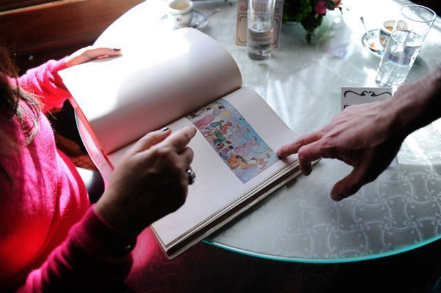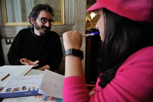 Così quando ho sentito Andrea per organizzare l’intervista, è al Gambrinus che abbiamo deciso di vederci, costringendo il povero e gentilissimo Massimiliano Rosati a cederci il posto: il tavolino dove è seduto coi suoi ospiti è proprio sotto i due quadri di Scoppetta, due scene sfocate della Napoli palcoscenico, sicuramente non lo Scoppetta migliore… ma tant’è. E’ qui, sotto le due opere, che ci sediamo Andrea, io e le nostre armi, a regolare un antico duello tra i nostri antenati, Pietro e Maria; io con un quadernetto e una penna (e Francesco Paolo Busco a scattare foto!) e lui con cartoncini, matite, pennelli e colori. Perché l’idea è che lui, discendente di Scoppetta, illustratore a sua volta, immortali me, molto meno avvenente della bisnonna Maria Zaccagnino, le mie rughe, la mia coppola e i miei occhi “inafferrabili”. “Ma hai tanti sguardi tutti validi” mi dirà alla fine, al terzo ritratto finalmente un po’ sentito, dopo tre ore di conversazione, nel quale somiglio un po’ a Matilde Serao, cosa che me lo farà risultare eternamente simpatico.