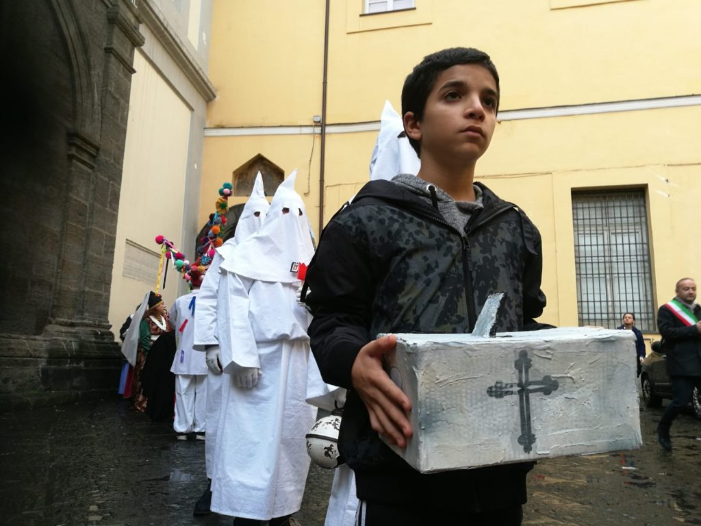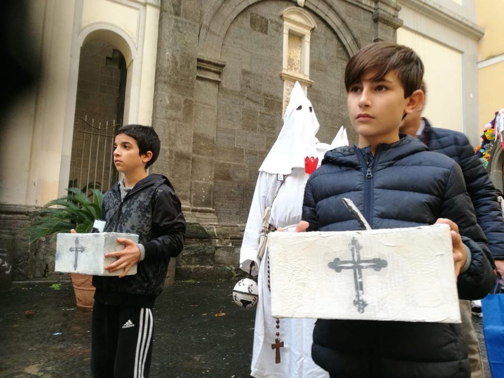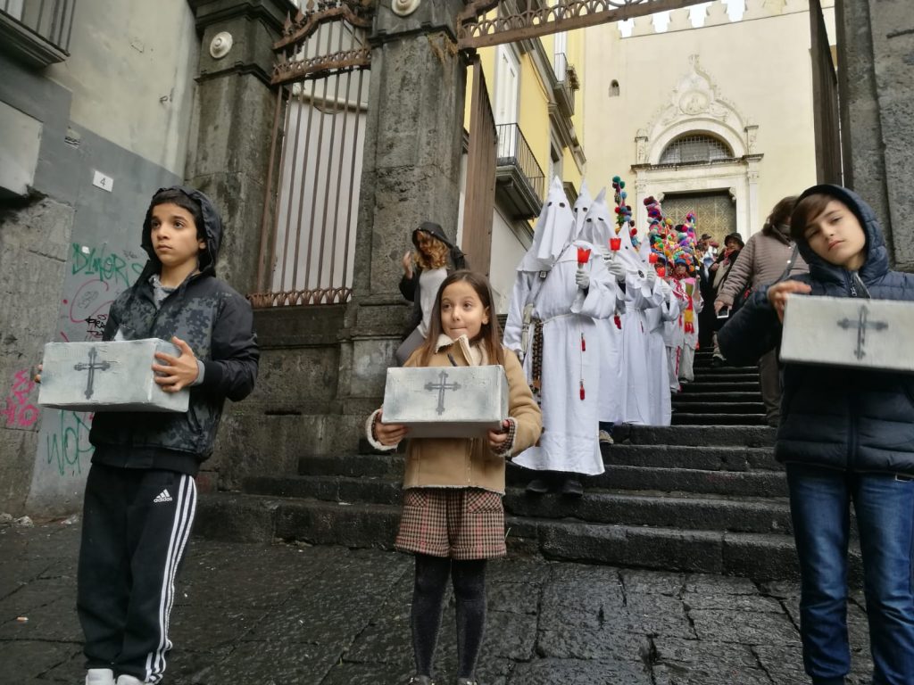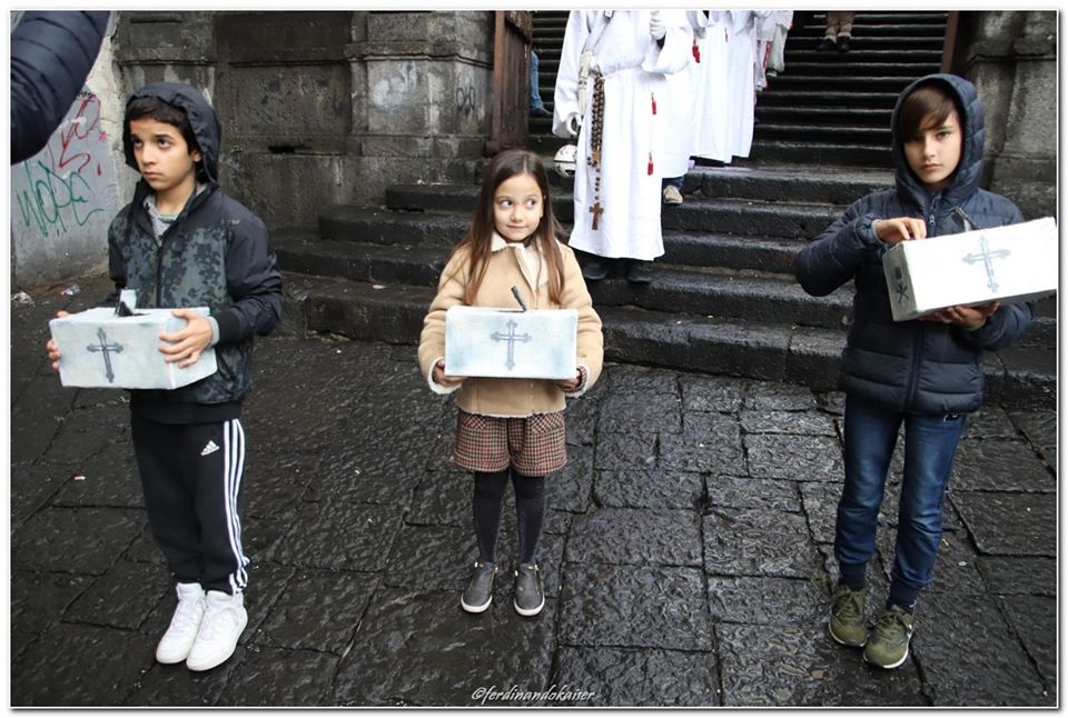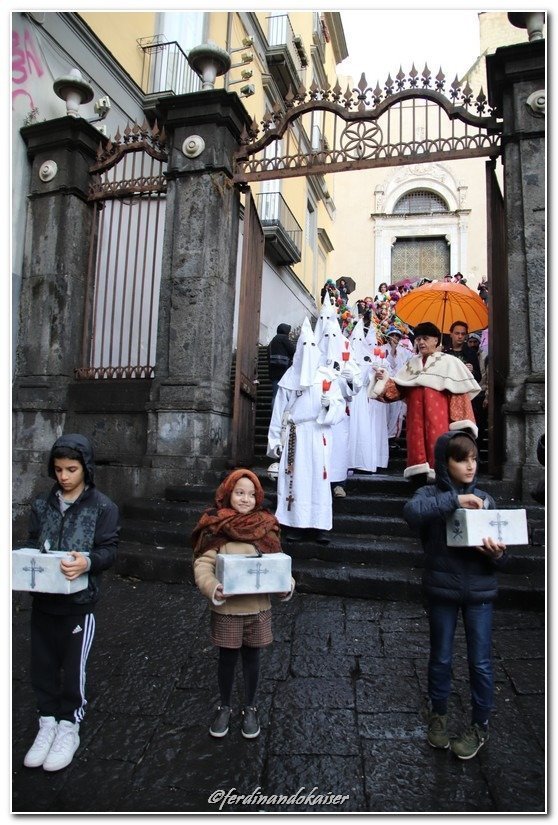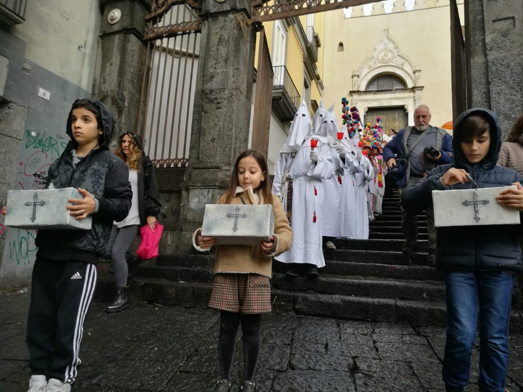 Sophia, la figlia del nostro Antonio Corradini, Paolo e Massimo, due bimbi venuti dall’Abruzzo e Miriam, la figlia di una nostra lettrice che ci ha commossi perché è venuta con la sua cascettella, fatta con le sue manine come facevano i bimbi di un tempo (alcuni le compravano dalle “zarellare”, come racconta appunto Eduardo in Filumena, altri le facevano da soli come racconta un padre del futurismo quale il napoletano Francesco Cangiullo nel libro “Le vie della città” del 1937): sono stati loro i quattro bimbi protagonisti di questa giornata piovosa ma piena di passione, che ha visto tanti partecipare (110 persone sono venute dall’Abruzzo, con Fontevecchia) per ritrovare questa antica usanza, insieme alla tradizione dei frati morti e dei coloratissimi Pulcinella abruzzesi. Una mattinata gioiosa e anche danzante, nelle sale di San Domenico Maggiore, con Fantasie d’Epoca a organizzare quadriglie che hanno coinvolto tutti, anche i bambini.