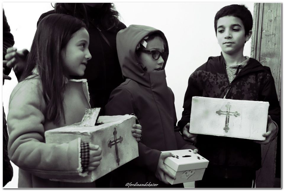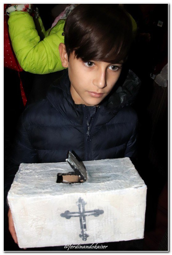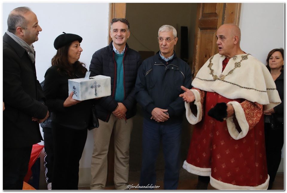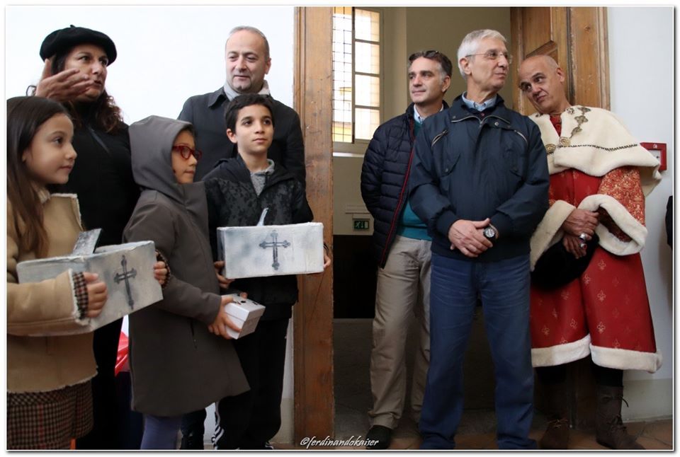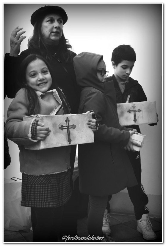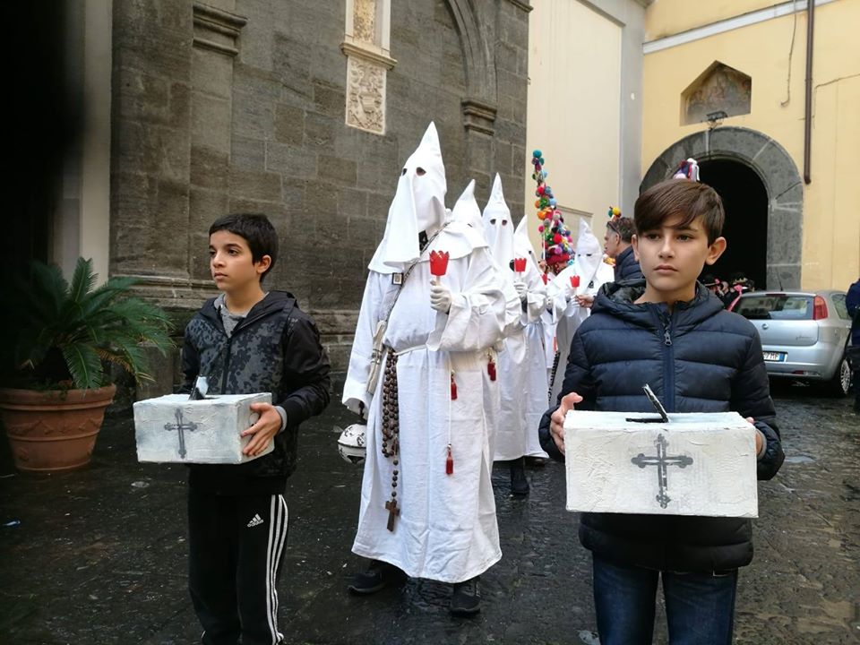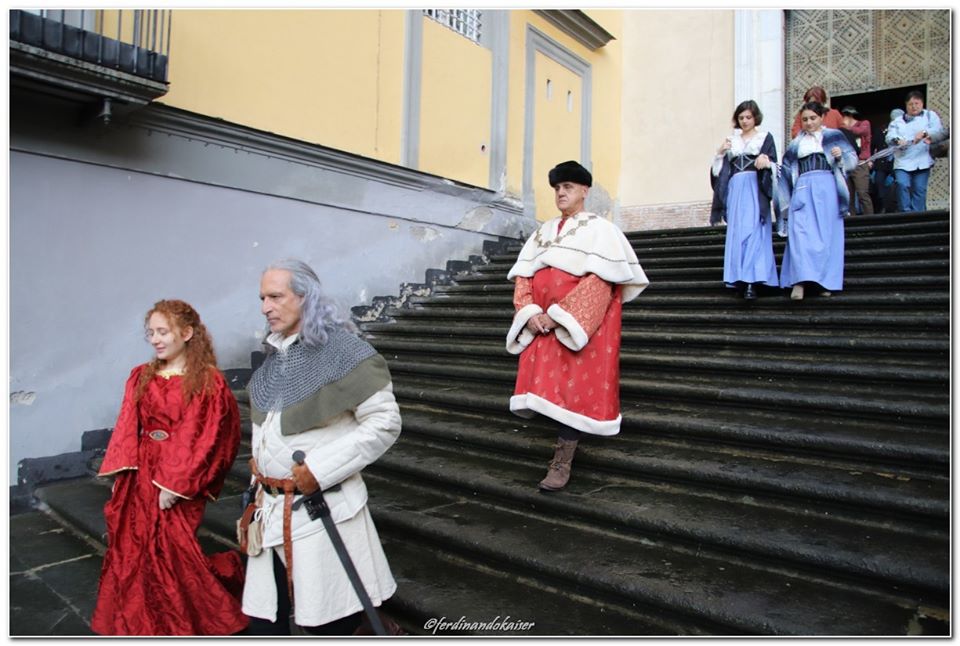 Sophia, la figlia del nostro Antonio Corradini, Paolo e Massimo, due bimbi venuti dall’Abruzzo e Miriam, la figlia di una nostra lettrice che ci ha commossi perché è venuta con la sua cascettella, fatta con le sue manine come facevano i bimbi di un tempo (alcuni le compravano dalle “zarellare”, come racconta appunto Eduardo in Filumena, altri le facevano da soli come racconta un padre del futurismo quale il napoletano Francesco Cangiullo nel libro “Le vie della città” del 1937): sono stati loro i quattro bimbi protagonisti di questa giornata piovosa ma piena di passione, che ha visto tanti partecipare (110 persone sono venute dall’Abruzzo, con Fontevecchia) per ritrovare questa antica usanza, insieme alla tradizione dei frati morti e dei coloratissimi Pulcinella abruzzesi. Una mattinata gioiosa e anche danzante, nelle sale di San Domenico Maggiore, con Fantasie d’Epoca a organizzare quadriglie che hanno coinvolto tutti, anche i bambini.