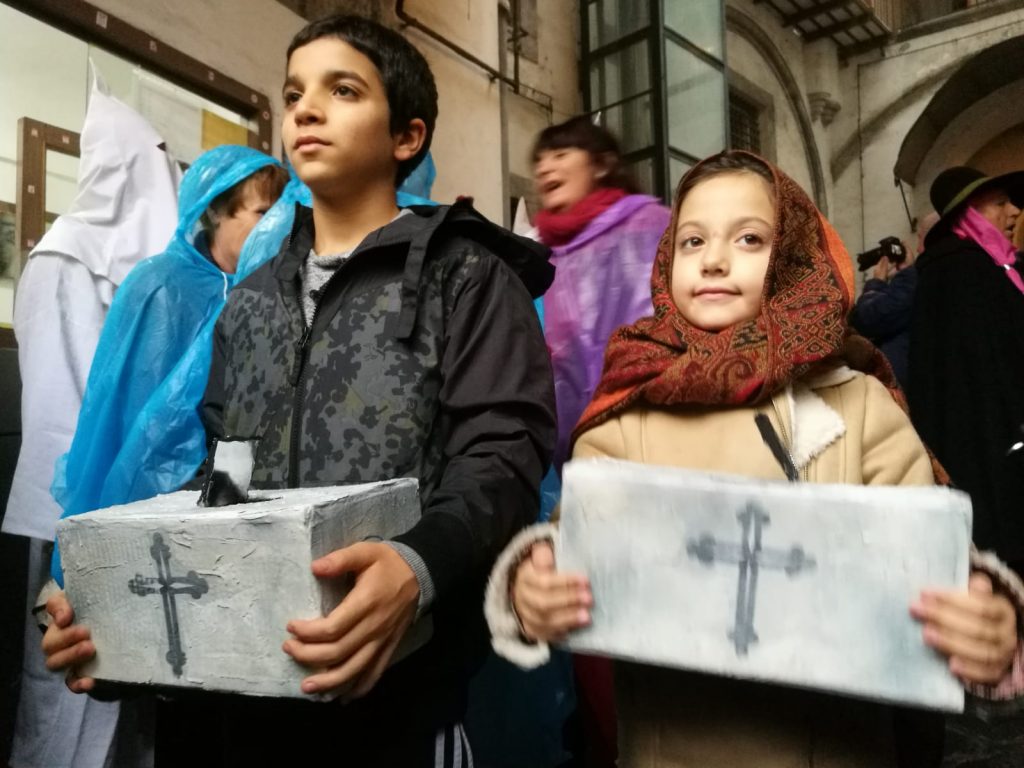 Una poesia del 1875, un moscone di Matilde Serao del 1906. E poi Giuseppe Marotta nell’Oro di Napoli e Eduardo in Filumena Marturano. E risale più o meno agli anni di Eduardo e Marotta anche il racconto di Francesco Cangiullo, tra i geni del futurismo. Una tradizione durata fino agli anni 70 come testimoniano le foto di Mimmo Iodice. Per tre anni abbiamo raccolto riferimenti letterari a quella che per semplicità chiameremo “la Halloween dei bambini napoletani”: una tradizione secolare interrotta, secondo lo scrittore Maurizio Ponticello, ieri presente alla nostra manifestazione (intervistato nel nostro live) nel 1969, quando il cardinal Ursi vietò le tradizioni legate ai morti perché ritenute pagane. I bimbi giravano con le cascettelle per chiedere un soldino per le anime dei defunti. Poi con quei soldini, come ci hanno raccontato gli utenti della pagina fb Napoli Retrò, compravano gelati e caramelle o portavano un cero ai morti e ai bimbi senza nome.