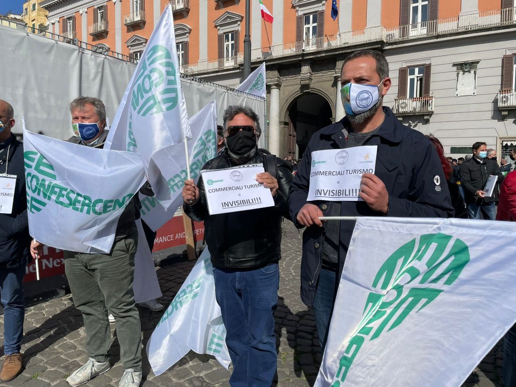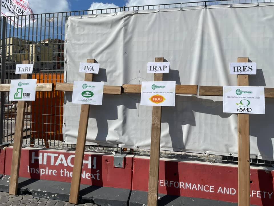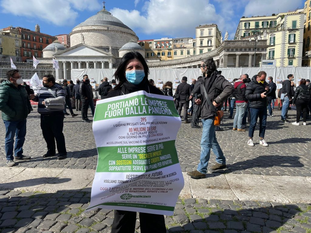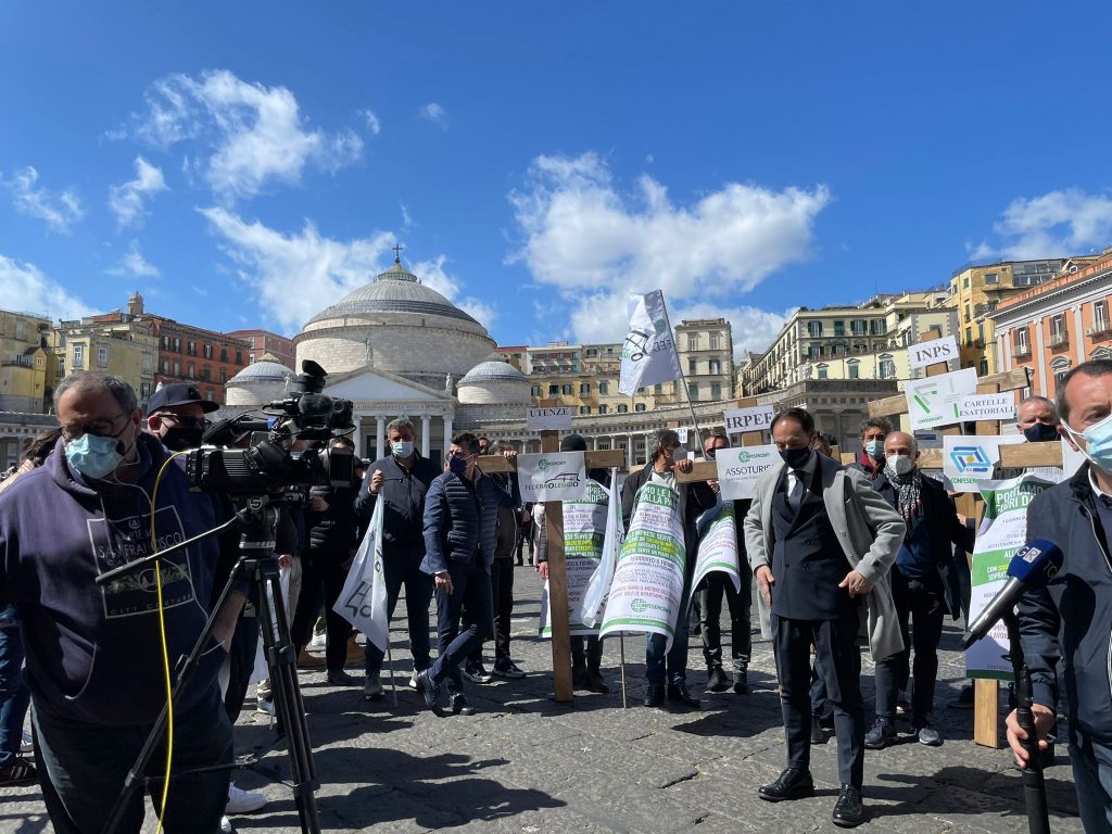 Il mondo delle imprese campane rappresentato da Confesercenti regionale è sceso in piazza del Plebiscito questa mattina, esponendo delle croci, “simbolo della disperazione di ciascun settore commerciale, ormai alla resa a causa della pandemia e del sostegno scarso, inadeguato e intempestivo dei vari Governi”, si legge in una nota.