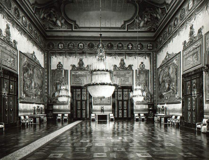 - Salone d’Ercole, assetto decorativo prima dei bombardamenti del 1943 (foto Alinari)