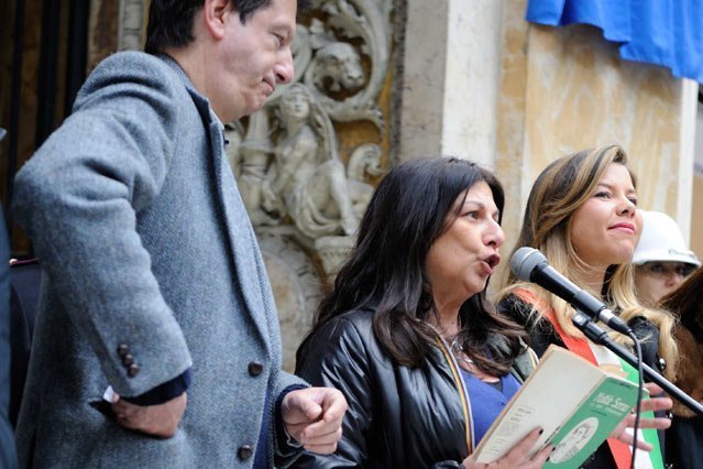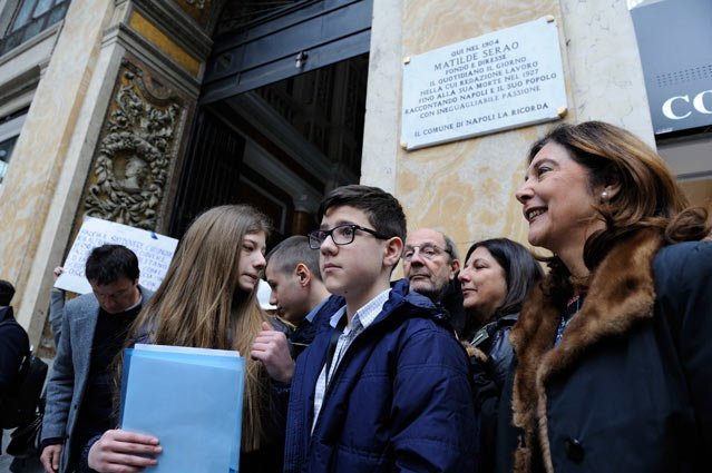 La forza travolgente di Matilde Serao questa mattina, ha portato dunque, qui, a Galleria Umberto 27 – dove quel giornale visse i suoi giorni migliori fino all’ultimo della sua fondatrice – assessori e comuni cittadini, studenti e appassionati. Anzitutto Alessandra Clemente, assessore alla toponomastica, che ha voluto sottolineare l’importanza delle donne nella storia della città ma anche dei valori più solidi del giornalismo. “Oggi ricordiamo il luogo di lavoro di Matilde Serao per ricordarci ogni giorno le frontiere di impegno affinché le donne possano essere libere e riconosciute”. Poi Giuliana Cacciapuoti, che con la Toponomastica Femminile da anni si batte proprio perché le donne della nostra storia siano ricordate, e Simonetta Marino, la molto amata delegata alle pari opportunità del Comune di Napoli, che si sono soffermate sull’importanza di una intitolazione al femminile. C’è anche la giornalista, Donatella Trotta, presente “per amore seraiano”, fondamentale e appassionata studiosa di Matilde Serao. Lei, che è stata la principale anima di tutto quanto ha ruotato intorno a Matilde in questi ultimi decenni, ha voluto ricordare proprio l’importanza della memoria, anche come cinghia di trasmissione di valori tra generazioni e tra giornalismi.