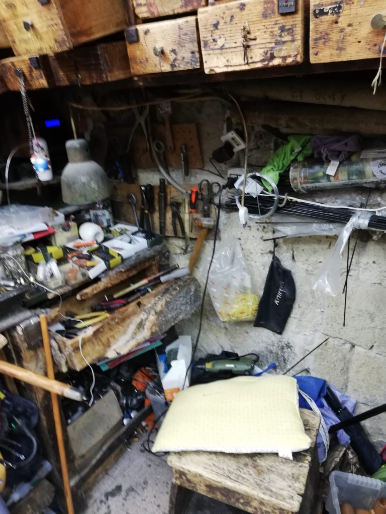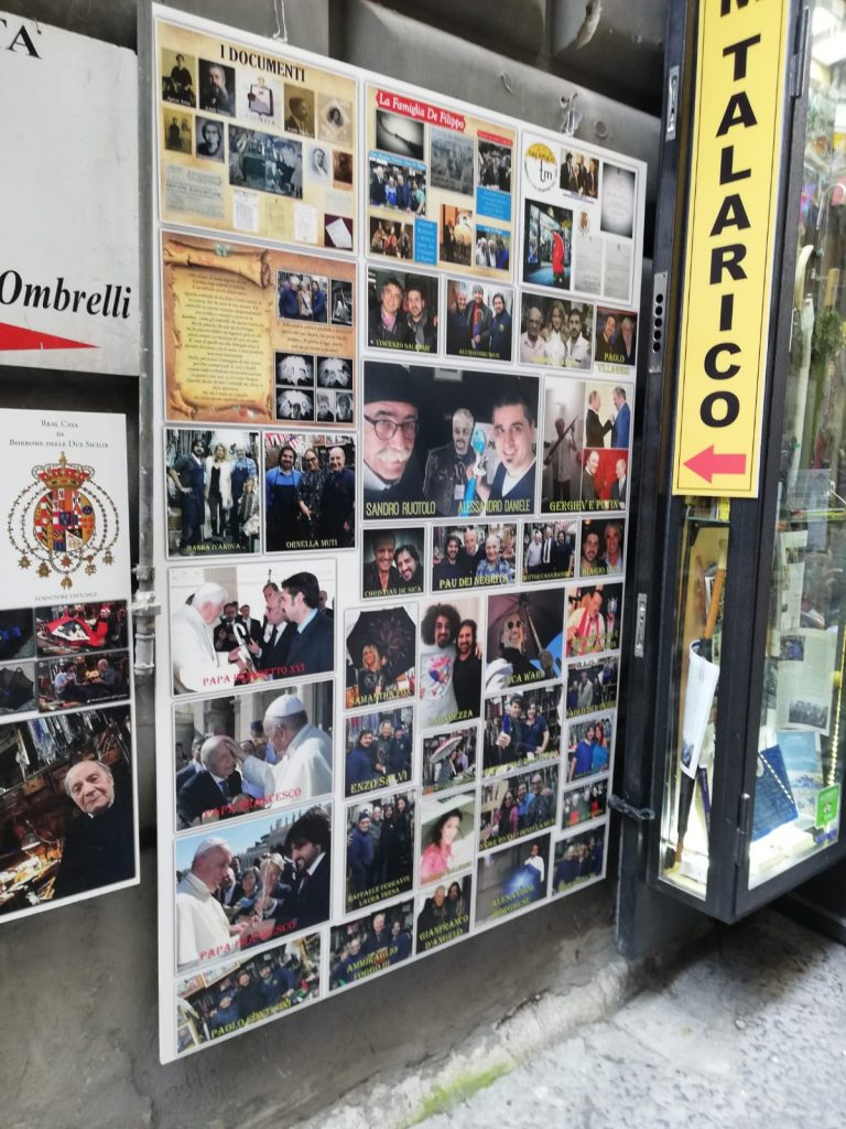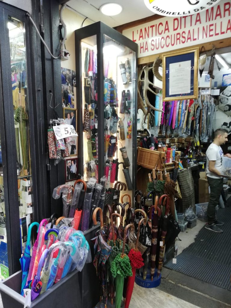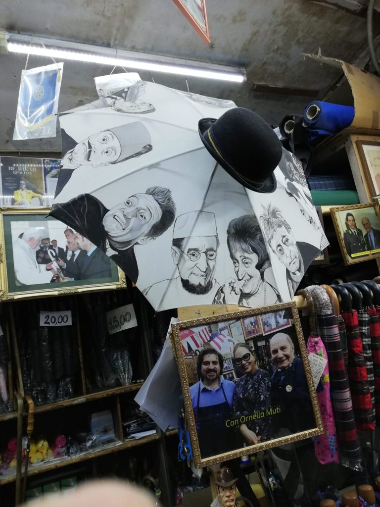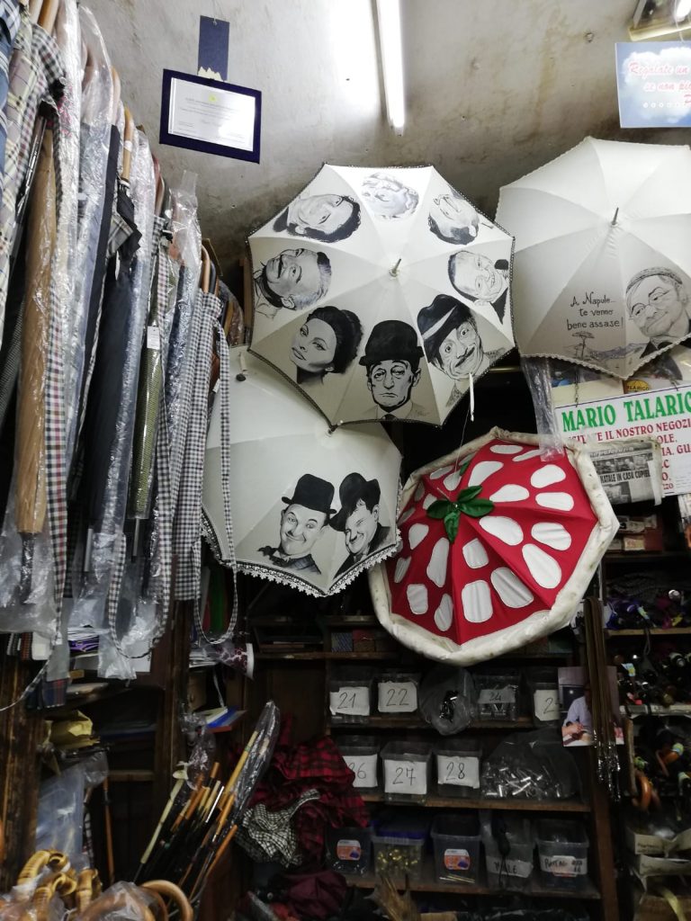 Il negozietto, un coloratissimo locale di nemmeno trenta metri quadrati (da non confondere con quello omonimo nello stesso vicolo, che non c’entra nulla con questo storico) è pieno di ombrelli sospesi qua e là da cui spuntano le immagini dei simboli più amati di Napoli, da Sophia Loren a Totò fino alla pizza, e poi canne di bambù, ombrelli di corno e dai pattern più raffinati, oggetti vari di lavoro. Alle pareti, foto incorniciate dei tantissimi personaggi famosi (italiani e stranieri) entrati in negozio, come Ornella Muti e Christian De Sica, Fendi e Lucio Dalla fino a quelli incontrati in altro luogo come Amadeus o addirittura il Papa, arricchiscono l’arredamento del negozio, insieme a qualche foto di Padre Pio e a diversi ritratti di famiglia, e contribuiscono a creare un’atmosfera accogliente e familiare. Quasi quasi dovremmo sperare che venga giù una pioggia scrosciante non solo per rifrescarci un po’ (vista la canicola di questi giorni), ma anche per aprire una di queste meraviglie. Appena entriamo, ci viene subito incontro il nipote, Mario junior (pare che Mario senior si sia preso la giornata libera). È alle prese con una coppia di clienti portoghesi che però lascia serenamente nelle mani del giovane collaboratore “poliglotta”, qualità indispensabile per poter lavorare qui.