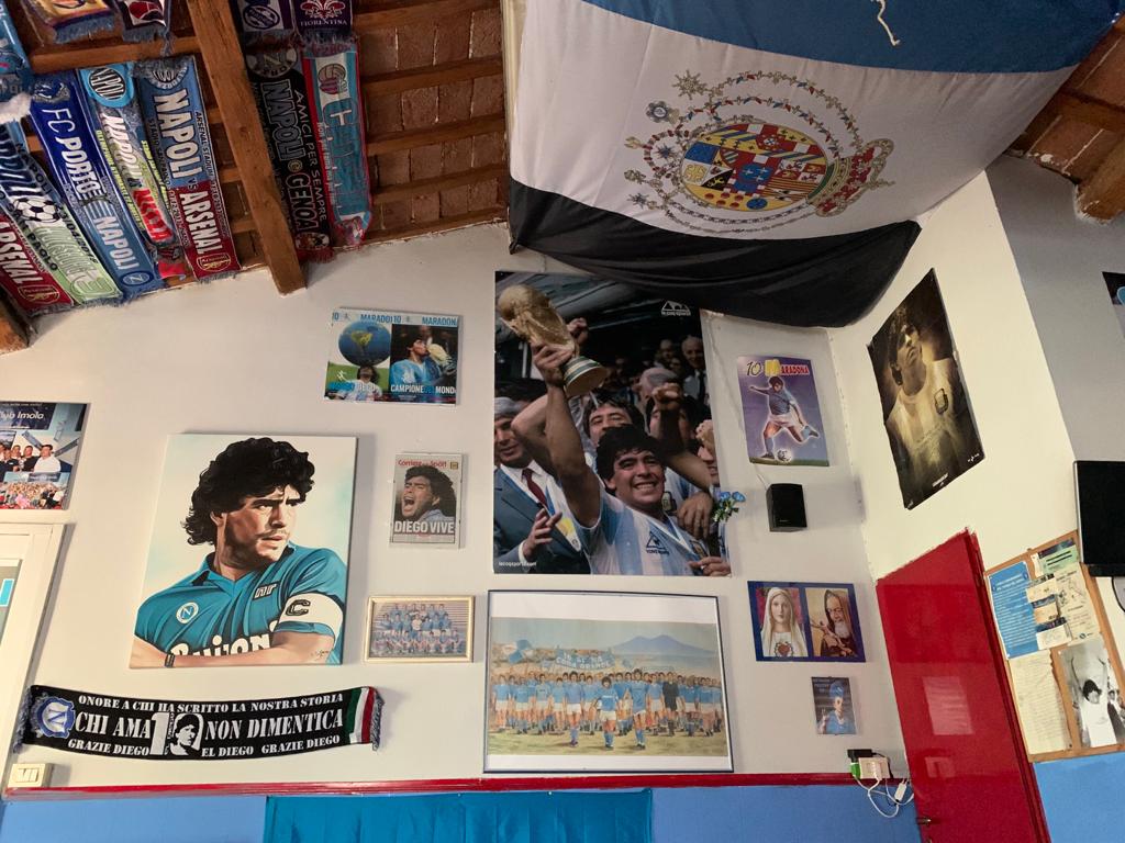 Alle pareti, tra le luci a led, non potevano mancare quadri di Diego e diverse bandiere del Regno delle due Sicilie, che non possono mancare né al club e né sulle maglie identificative del club”.