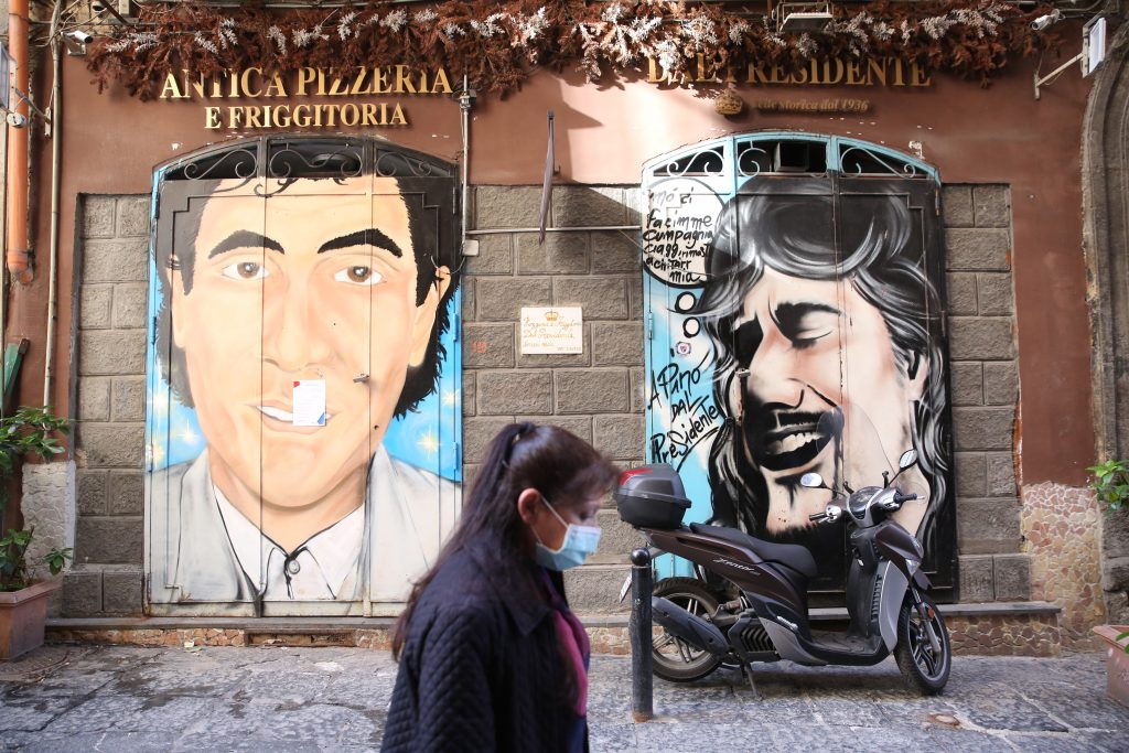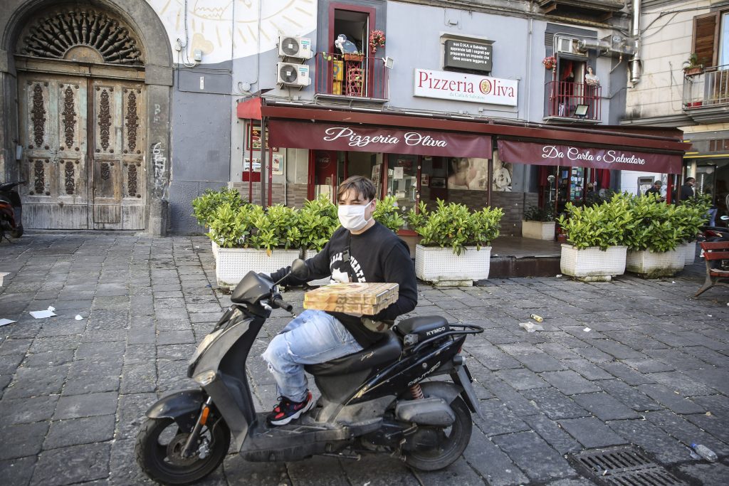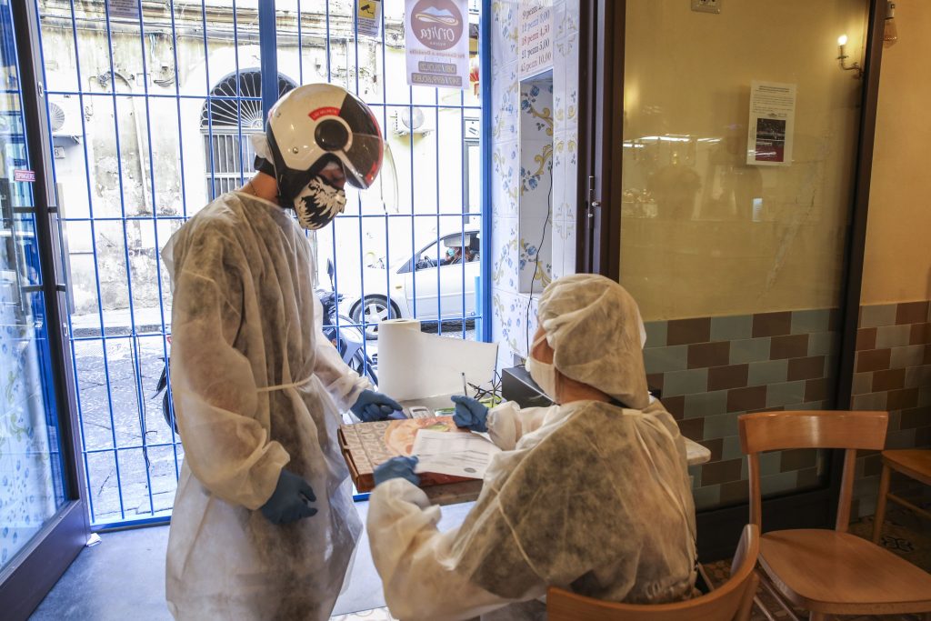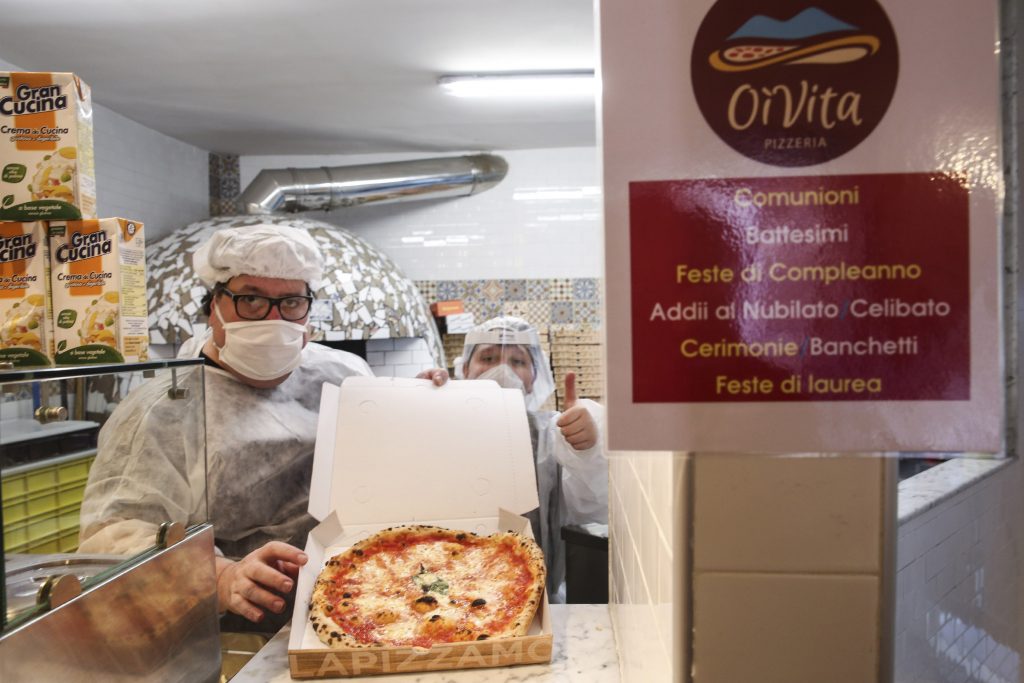 Facciamo una breve deviazione verso piazza San Vincenzo. Qui, a pochi passi dal cimitero delle Fontanelle, su via San Vincenzo la nostra attenzione viene attirata da una pizzeria con il cancello chiuso ma con un certo movimento dentro. Si chiama Oj Vita. Ci affacciamo tra le sbarre. C’è un tavolo con sopra una cassa e due donne, una con una tuta bianca protettiva e con la mascherina. Anche il ragazzo delle consegne che sta preparando la borsa, ha la mascherina, casco e una tuta bianca. Così come il pizzaiolo e il suo piccolo aiutante.