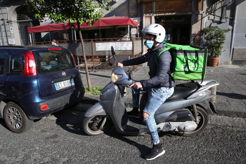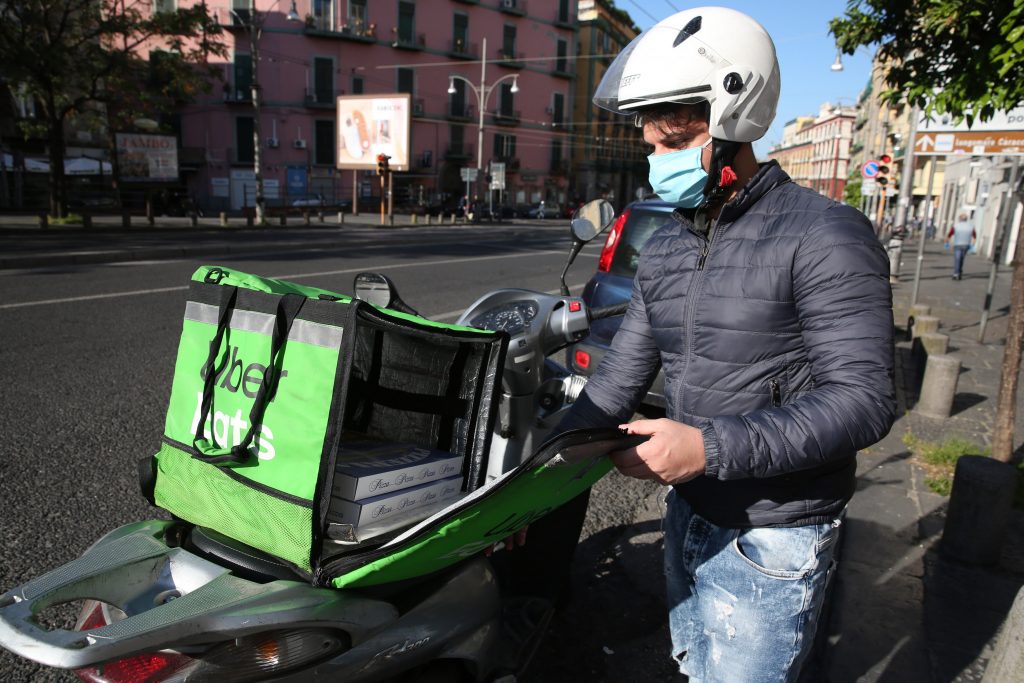 - Napoli, 27 Aprile 2020 – Un corriere Uber Eats nel centro di Napoli cerca di evadere alcuni tra le centinaia di ordini ricevuti, durarnte il primo giorno in cui è consentito il delivery per le pizzerie della Campania dopo il lockdown del Marzo per contenere i contagi del Virus Covid 19. ph. Roberta Basile KontroLab