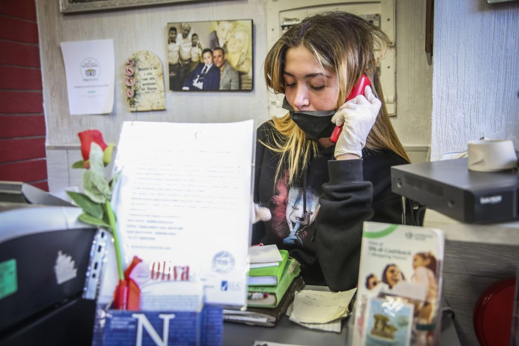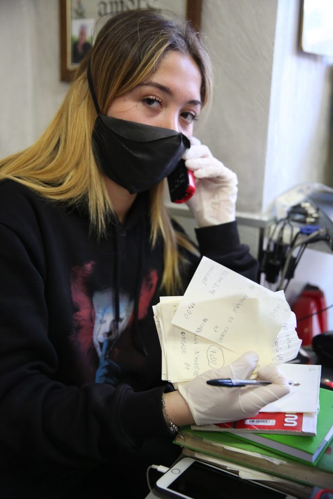 La signora, evidentemente la mamma di famiglia, ci spiega: “Si, abbiamo riaperto… io tengo sei figli, che dovevamo fare? E per fortuna stanno chiamando in tanti, il lavoro non manca, vedete?”. Anche loro ci mostrano foglietti di comande telefoniche. Anche loro contenti di ricominciare. La signora sorride, ci mostra i guanti, il disinfettante della Fondazione San Gennaro (“Ce l’ha dato la Chiesa, non ci possiamo lamentare”). E’ molto fiera di aver riaperto e di tornare al lavorare. Andiamo verso il forno e il marito pizzaiolo e il figlio si mettono in posa per noi, orgogliosi. E a noi scatta un’amorevole empatia. Promettiamo di andarci a fare una pizza presto da loro, quando sarà possibile.