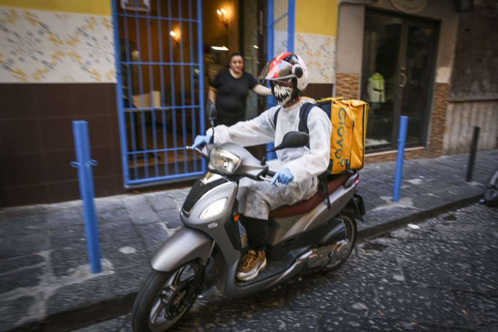 - Napoli, 27 Aprile 2020 – Un corriere Golovo nel quartiere Sanità cerca di evadere alcuni tra le centinaia di ordini ricevuti, durarnte il primo giorno in cui è consentito il delivery per le pizzerie della Campania dopo il lockdown del Marzo per contenere i contagi del Virus Covid 19. ph. Roberta Basile KontroLab