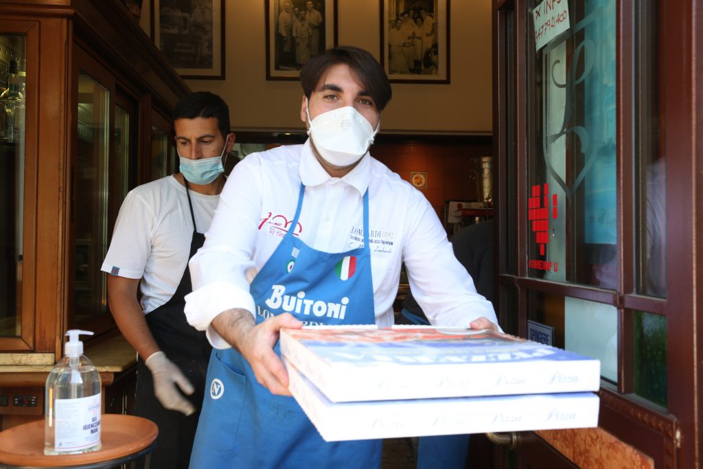 - Napoli, 27 Aprile 2020 – Il personale della centenaria Pizzeria Lombardi in via Foria cerca di evadere alcuni tra le centinaia di ordini ricevuti, durarnte il primo giorno in cui è consentito il delivery per le pizzerie della Campania dopo il lockdown del Marzo per contenere i contagi del Virus Covid 19. ph. Roberta Basile KontroLab