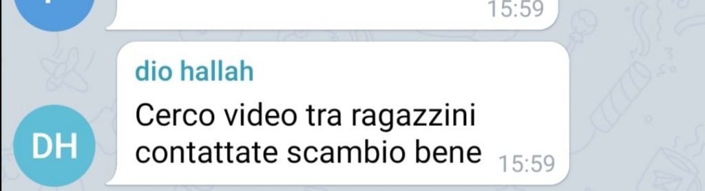 “Chi vuole queste due 06?“, scrive un certo Ecik. Oppure “Cerco video tra ragazzini contattate scambio bene” è la richiesta di dio hallah. E ancora, “Chi scambia figlia?“, “Cerco mega incesti mando video moglie” e via con una valanga di messaggi di questo genere tra i quali compare anche un messaggio per le forze dell’ordine: “fanculo la finanza“, scrive un certo Group.